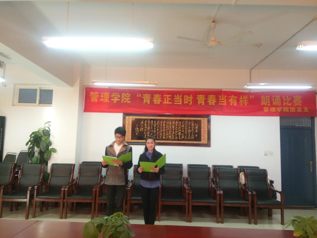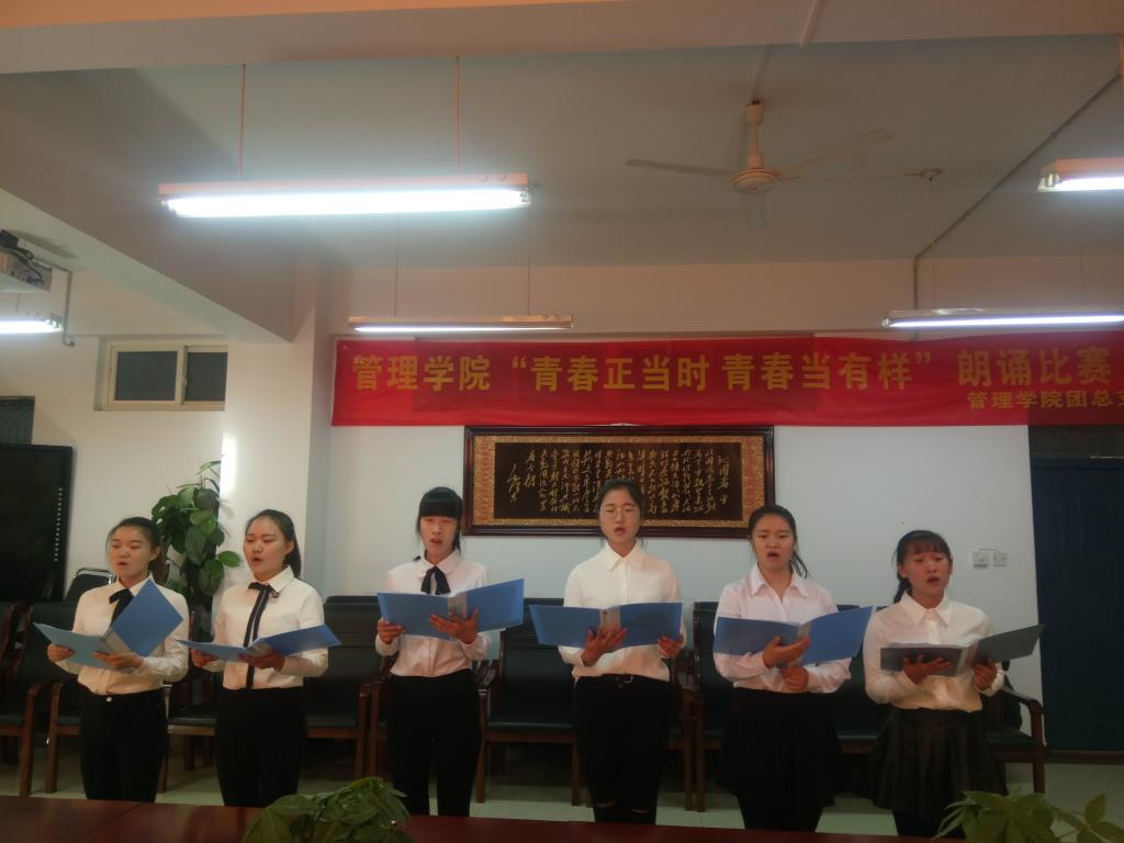 青春献礼十九大,不忘初心跟党走。管理学院团总支于11月24日在A03二楼会议室举办“青春正当时,青春当有样”主题朗诵比赛。2017级辅导员宋旸、井稚惠,2016级辅导员王翀三位老师,管理学院学生会主席团,以及各团支部推选出的十组选手参与本次大赛。