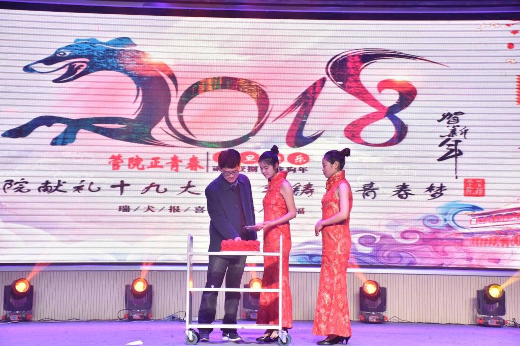 郭院长在晚会上发表新年致辞,对我院过去一年取得的成绩给予充分肯定,并代表院系向全体师生表示亲切的问候和良好的祝愿。随后,晚会在火热的开场舞中拉开帷幕。一幕《后宫传》嗨翻全场,以诙谐幽默的语言赢得台下阵阵掌声;一曲《耿耿于怀》讲述着单纯的美好,令人回忆起那些年的青春;老师们倾情献唱《爱,因为在心中》表达了浓浓的师生情谊。接着,晚会进入下一个环节,我院为庆祝新乡学院升本十周年特献上了生日蛋糕,并举办隆重的切蛋糕仪式,孙院长为大家送上了新年的祝福并切下第一刀。晚会精彩继续,主席团呈现一场歌伴舞《给我一个吻》,使得全场氛围迅速升温。抽奖环节现场观众积极互动,更是将晚会推向高潮。美好的时间匆匆而过,一曲《心愿时光》表达了新院十年风雨历程,为本场晚会画上圆满句号。
