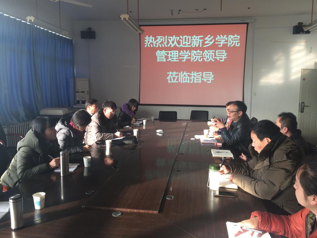 为推进地方性应用型专业建设,更好得完成校企融合服务地方本科院系建设的目标,2015年12月30日,管理学院院长申成玉、书记娄季春携院系相关人员一行7人赴河南工程学院进行实地考察交流,受到了河南工程学院人事处处长徐丽萍、工商管理学院院长张贯一教授、书记张文敬等领导的热情接待。