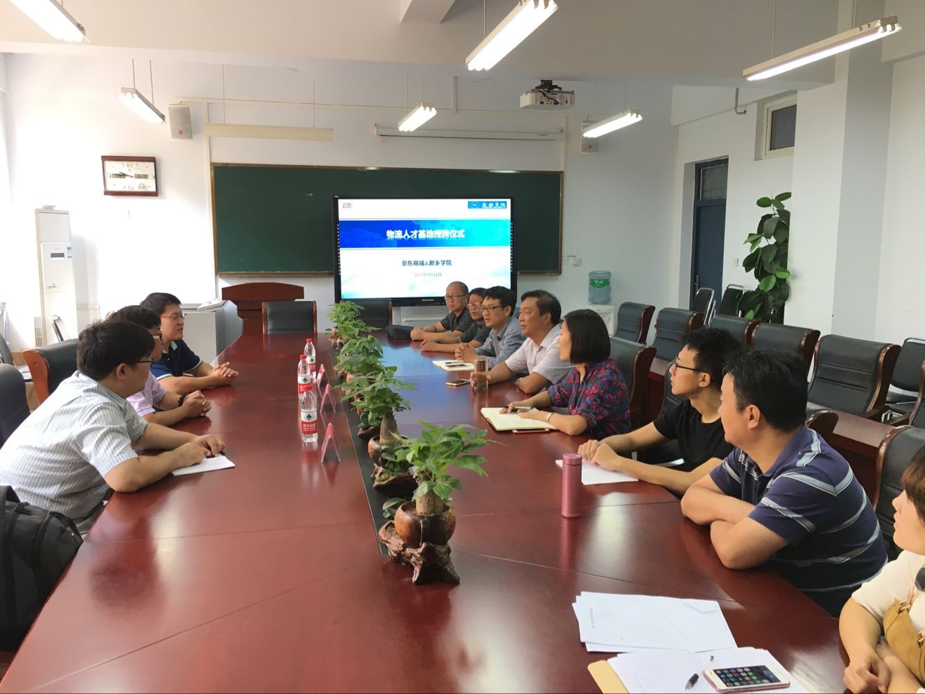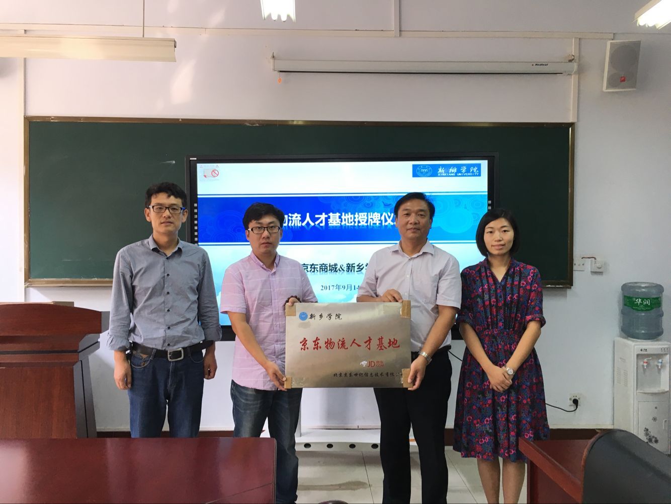 2017年9月14日上午,京东物流华北分公司人力资源部副总经理王琦等一行三人莅临我院参加“京东商城&新乡学院物流人才基地授牌仪式”。申成玉院长,孙江超副院长,郭丽娜副院长,物流教研室主任董素玲及物流专业骨干教师参加本次仪式。
